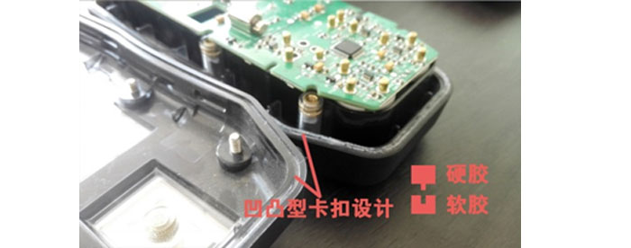 像上圖便攜式氣體檢測(cè)儀,采用硬膠+軟膠雙層材料,通過(guò)軟硬擠壓形成密封面,可有效防水防塵。